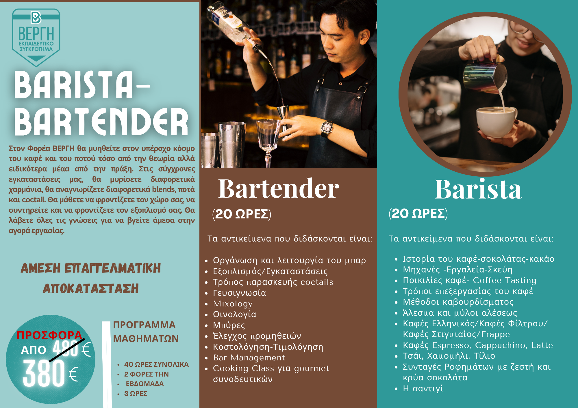 Το Εκπαιδευτικό Συγκρότημα Βέργη, πιστό στην φιλοσοφία να προσφέρει υψηλού επιπέδου εκπαίδευση και κατάρτιση προσφέρει τα εφόδια που χρειάζονται, συνδυάζοντας τόσο τη θεωρητική εκπαίδευση όσο και την πρακτική εξάσκηση ώστε να δημιουργήσει bartenders υψηλου επιπέδου.